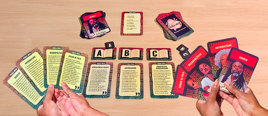 Troca-Ideia é um jogo cooperativo que busca colocar em discussão conceitos étnico-raciais. Um jogador associa um conceito a narrativas de situações ou músicas, e o grupo conversa para tentar adivinhar o que essa pessoa pensou.